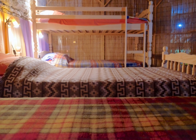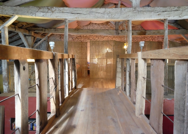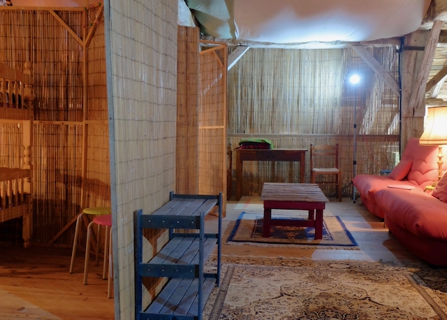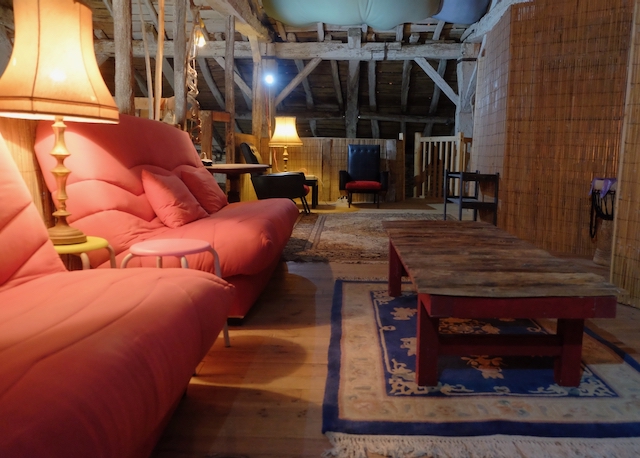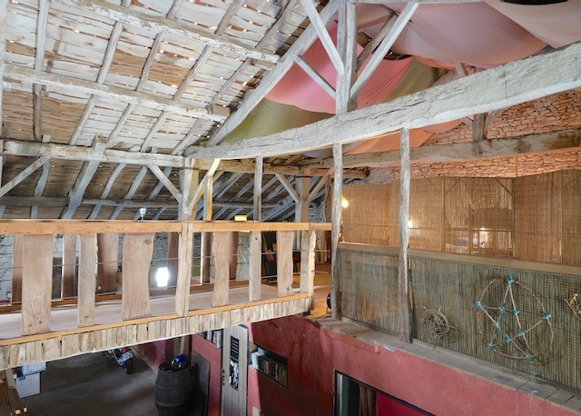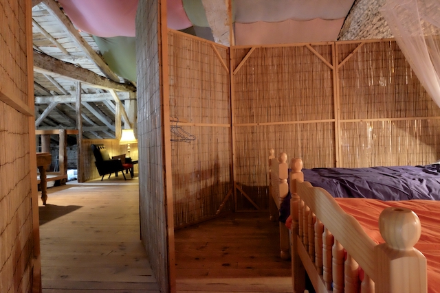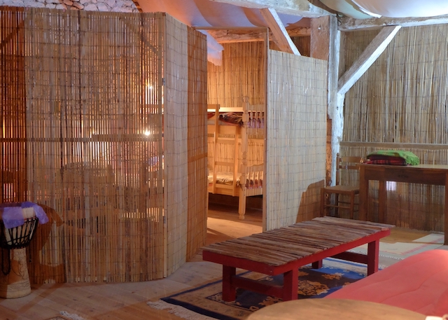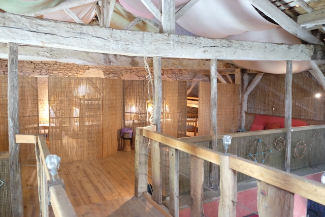 The Beds in the Barn are a rough and ready rustic retreat in a wonderful 300 year old barn with a unique ‘back-packer’ meets ‘tree-house’ feel. Bamboo screens separate two sleeping areas, both with 4 beds in each. A family might be all together, or parents could stay on one side, while their teenage kids stay on the other, creating a sense of closeness and separation at the same time. It’s not private, but discreet. Only people known to you or the group will be occupying this space. Associated seating areas on the mezzanine level are also exclusive to those staying in the beds. At this level, you’ll have plenty of space to make your own during your stay.