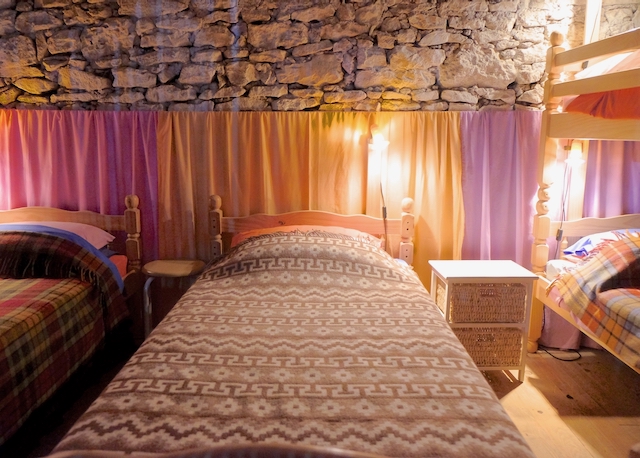 Accessed by 2 staircases, one spiral, this dormitory accommodation is made up of 8 single adult beds, 2 of which are a set of bunks. It is ideal for a family of four or more, or for friends celebrating a get-together, or a group undertaking a course or workshop. Double showers, wash basins and toilets are all at ground level.
